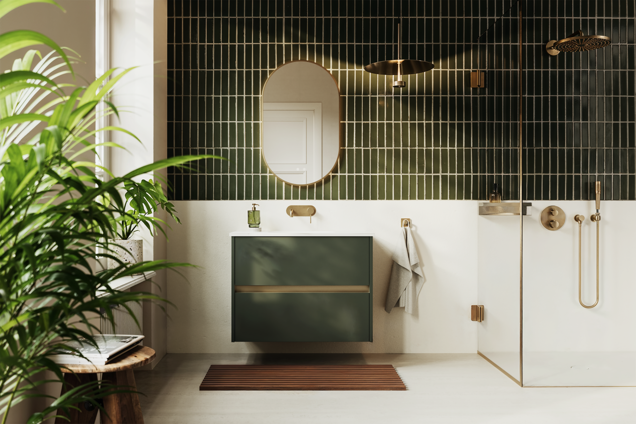 Clean slab doors and a sleek integrated handle create a streamlined, contemporary look, with a wide choice of finishes to suit different bathroom styles.