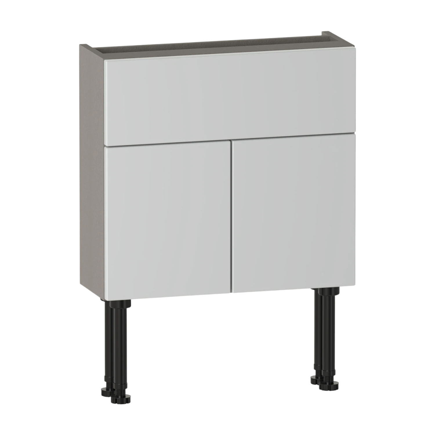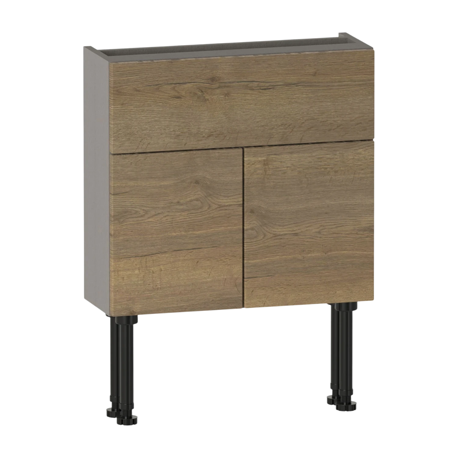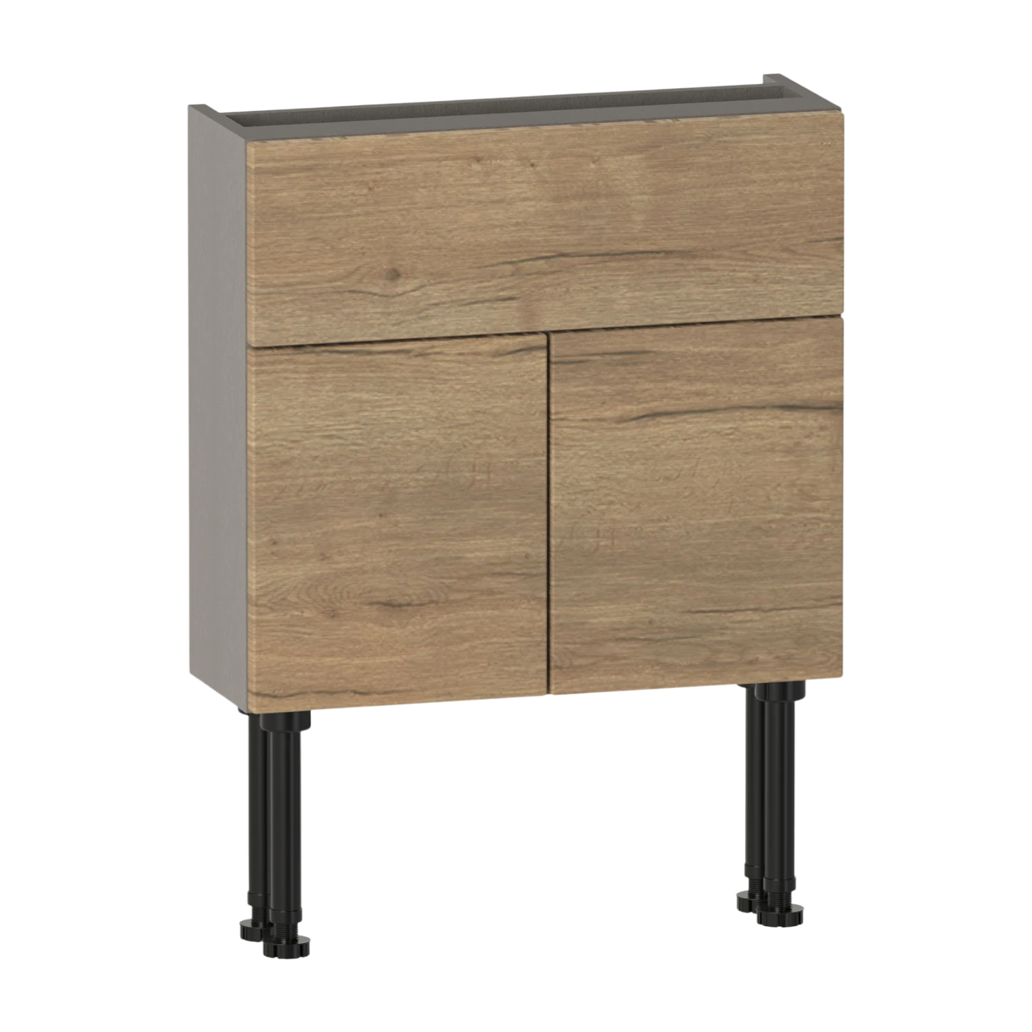 The Brecon 600 slim two door basin unit features two soft-close doors and an internal shelf for practical storage. A fixed upper panel includes a 50mm rear service gap to allow for pipework. Constructed from high quality furniture board for reliable everyday use,the carcass is supplied assembled for straightforward installation. Pair with a basin to complete the unit. This unit has a 561 height carcass to allow you to conceal additional pipework beneath the unit,or it can be wall hung using the included wall fixing kit.