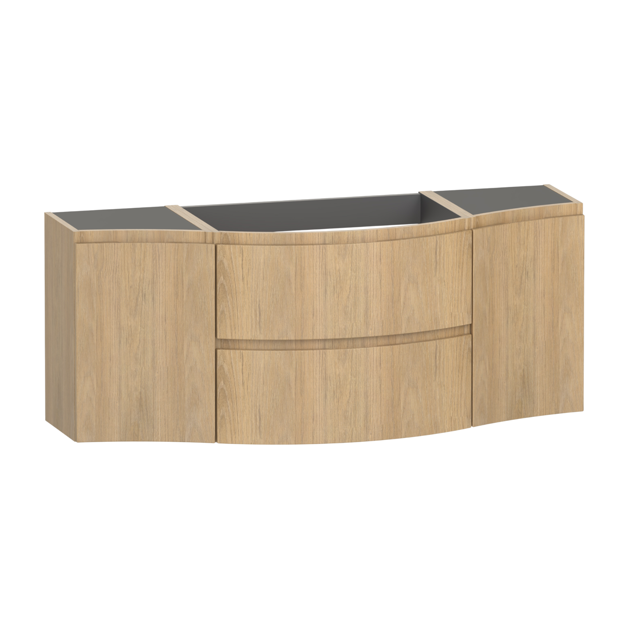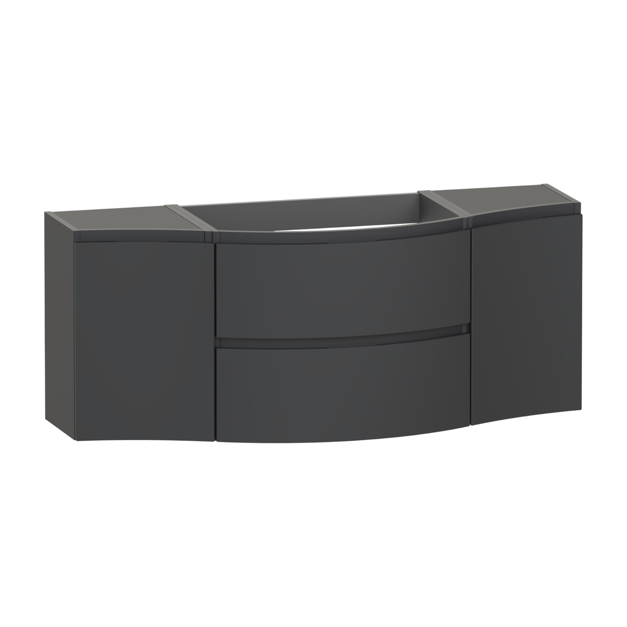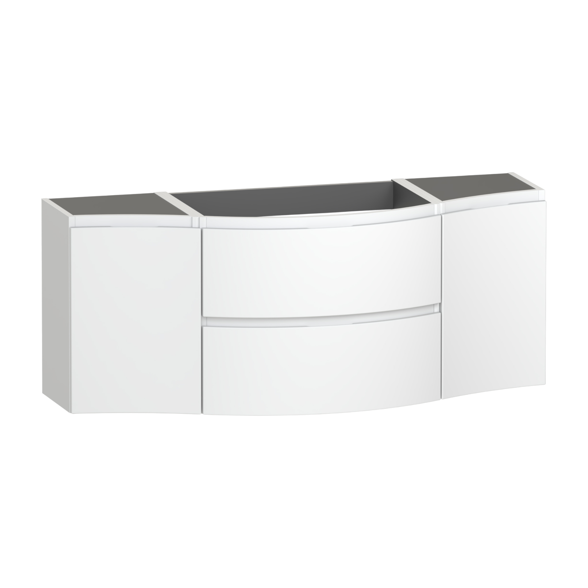 The Levanto 1375 double wing vanity combines generous storage with elegant simplicity,designed to make daily routines effortless. Two soft close drawers glide smoothly to hold everyday items neatly,while the double cupboards offers additional space for taller essentials. Its integrated handles and wall hung design create a light,floating effect that opens up the room. Designed for a centre bowl wing basin,or a double wing Levanto worktop and a sit-on bowl.
