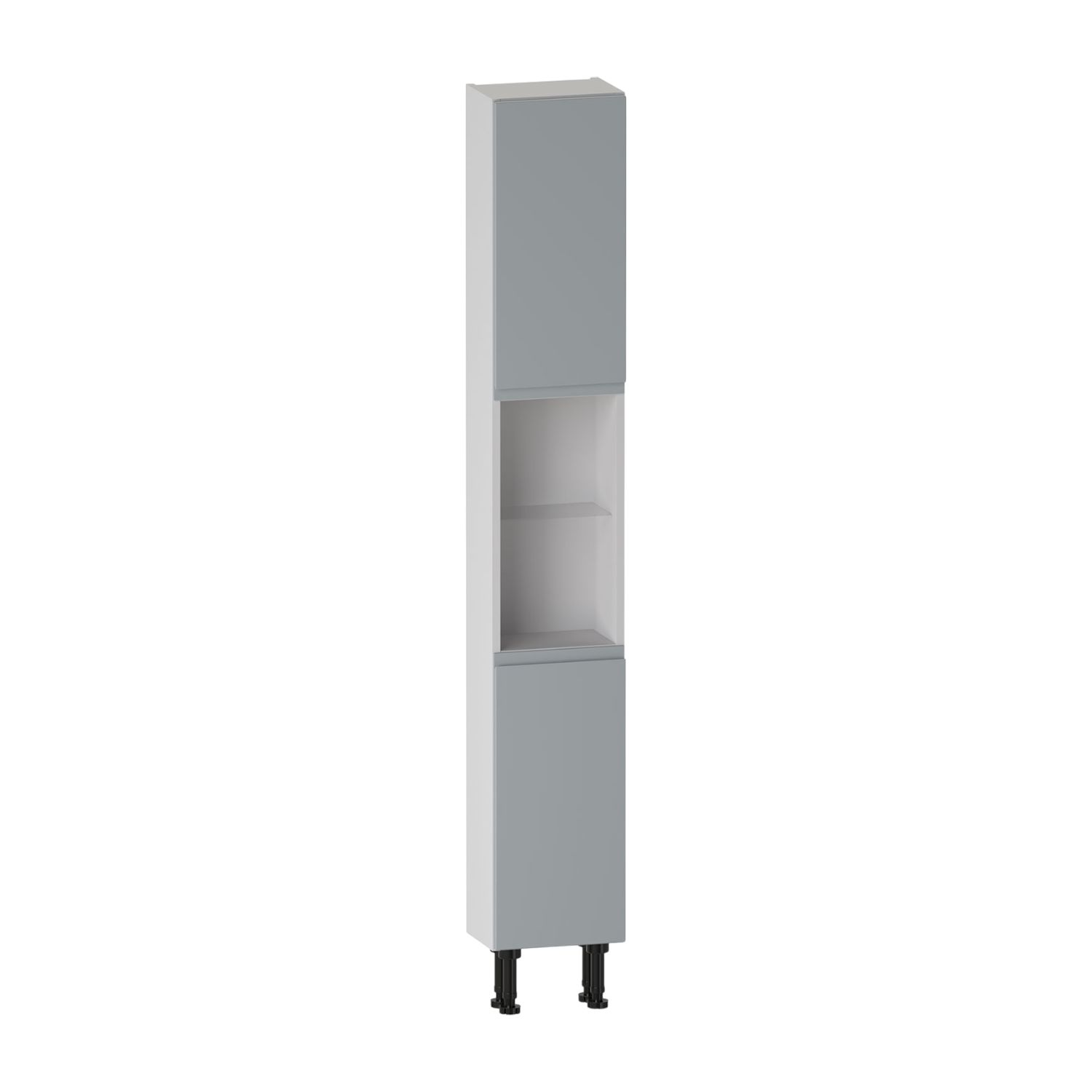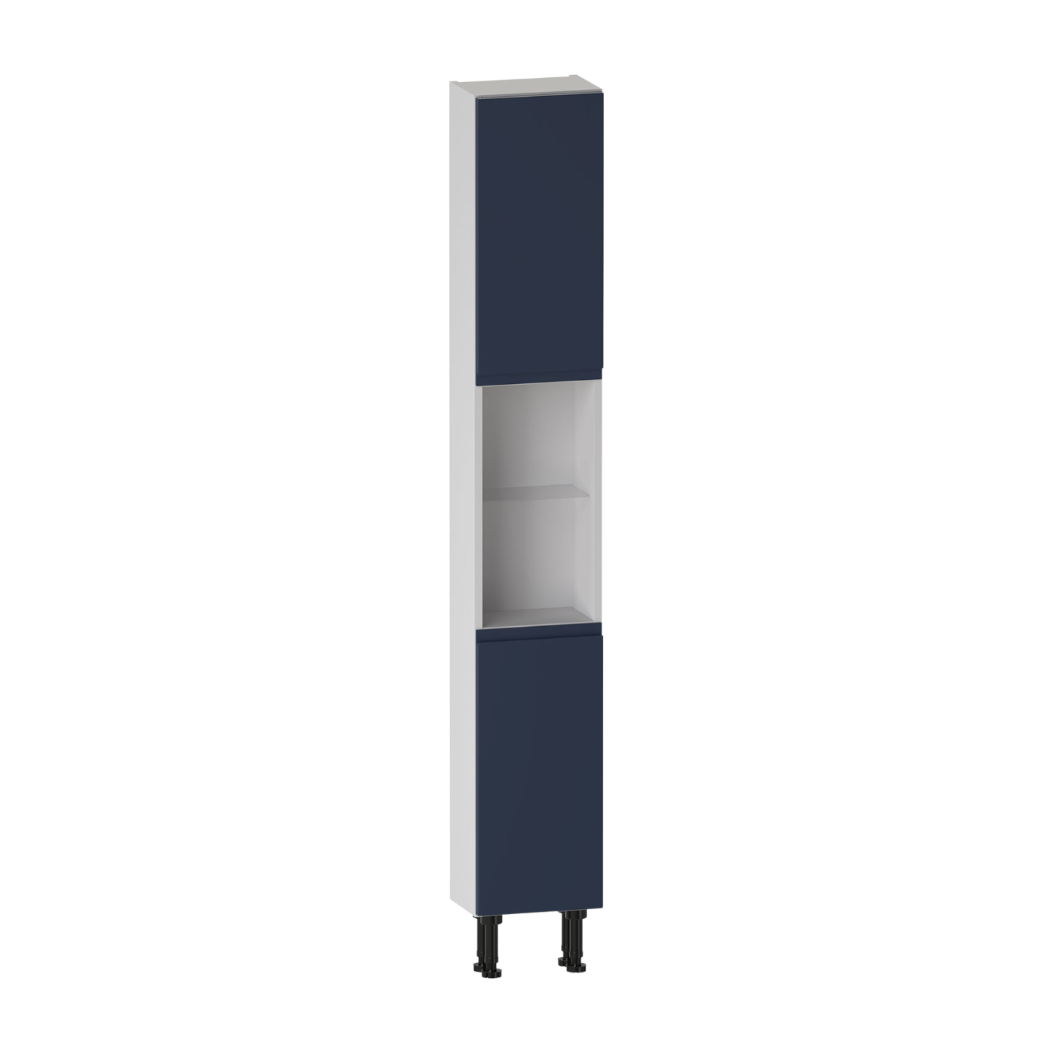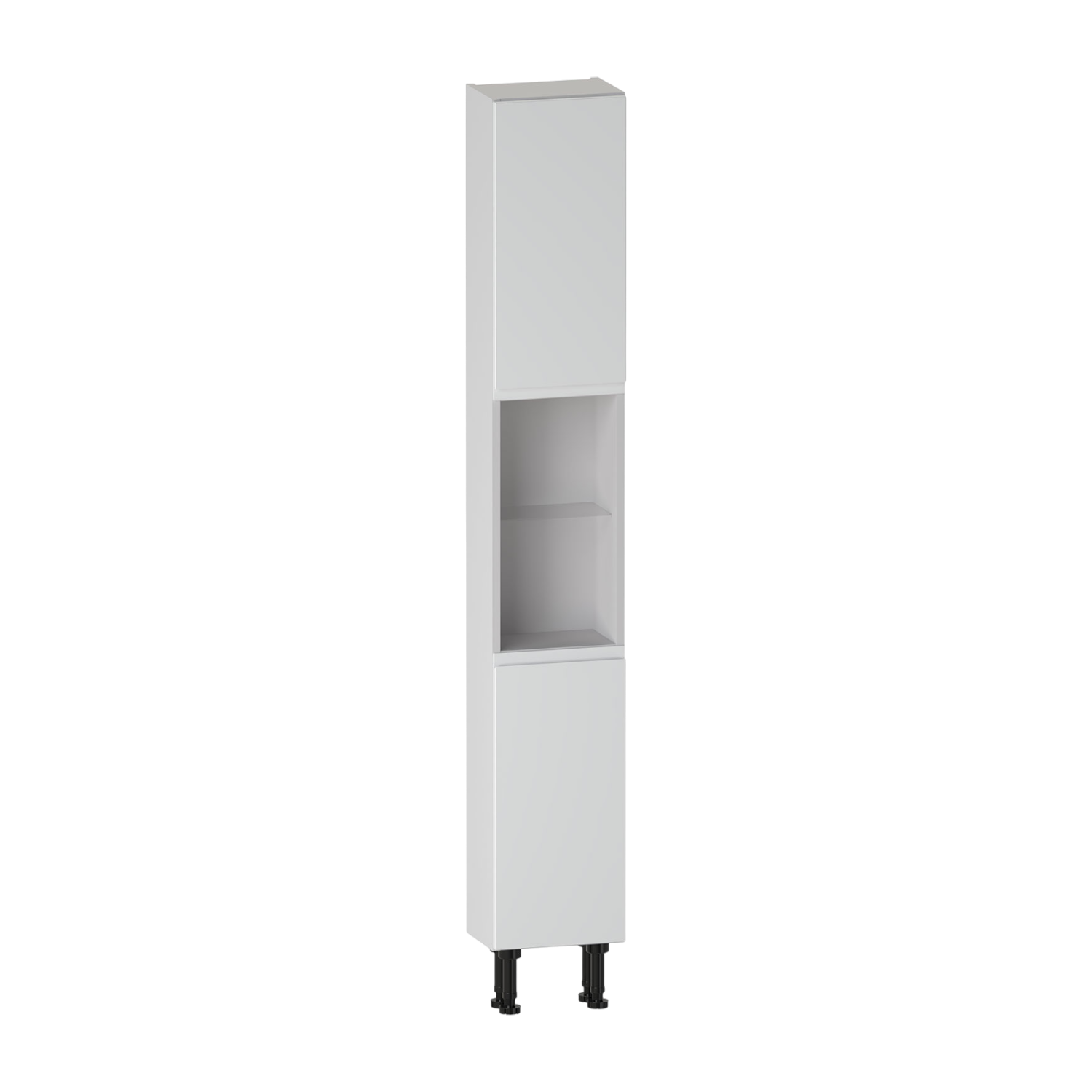 The Selter 300 high rise unit features two soft-close,right-hinged doors covering the upper and lower section of the unit,concealing internal shelving for organised storage. An open middle section with glass shelf adds practical display storage. Built from durable furniture board for dependable everyday use. The carcass comes supplied assembled for easy installation.