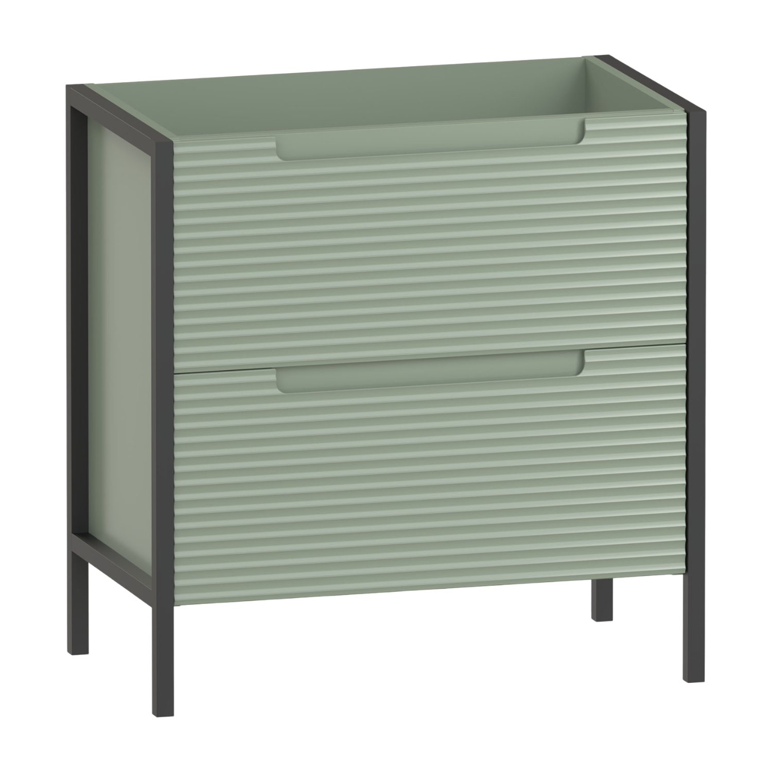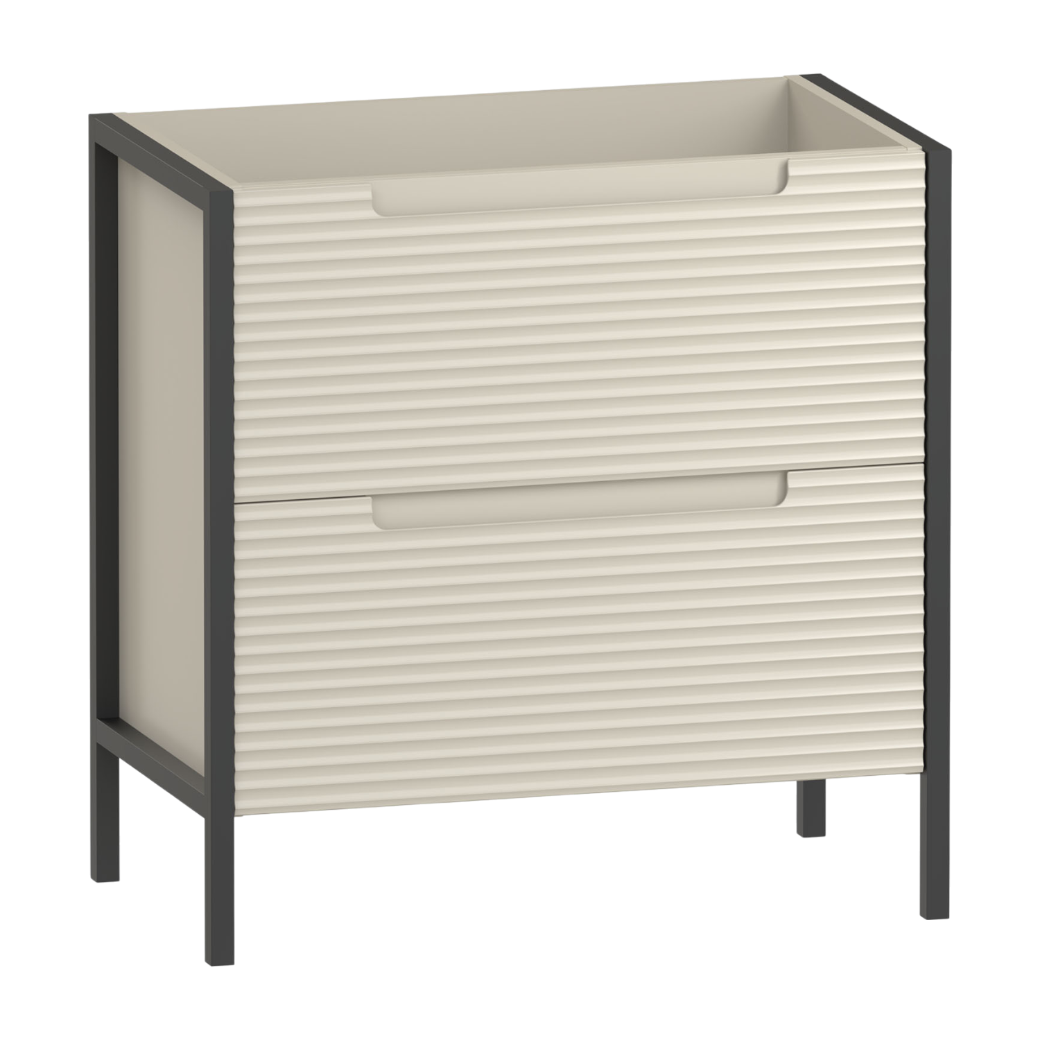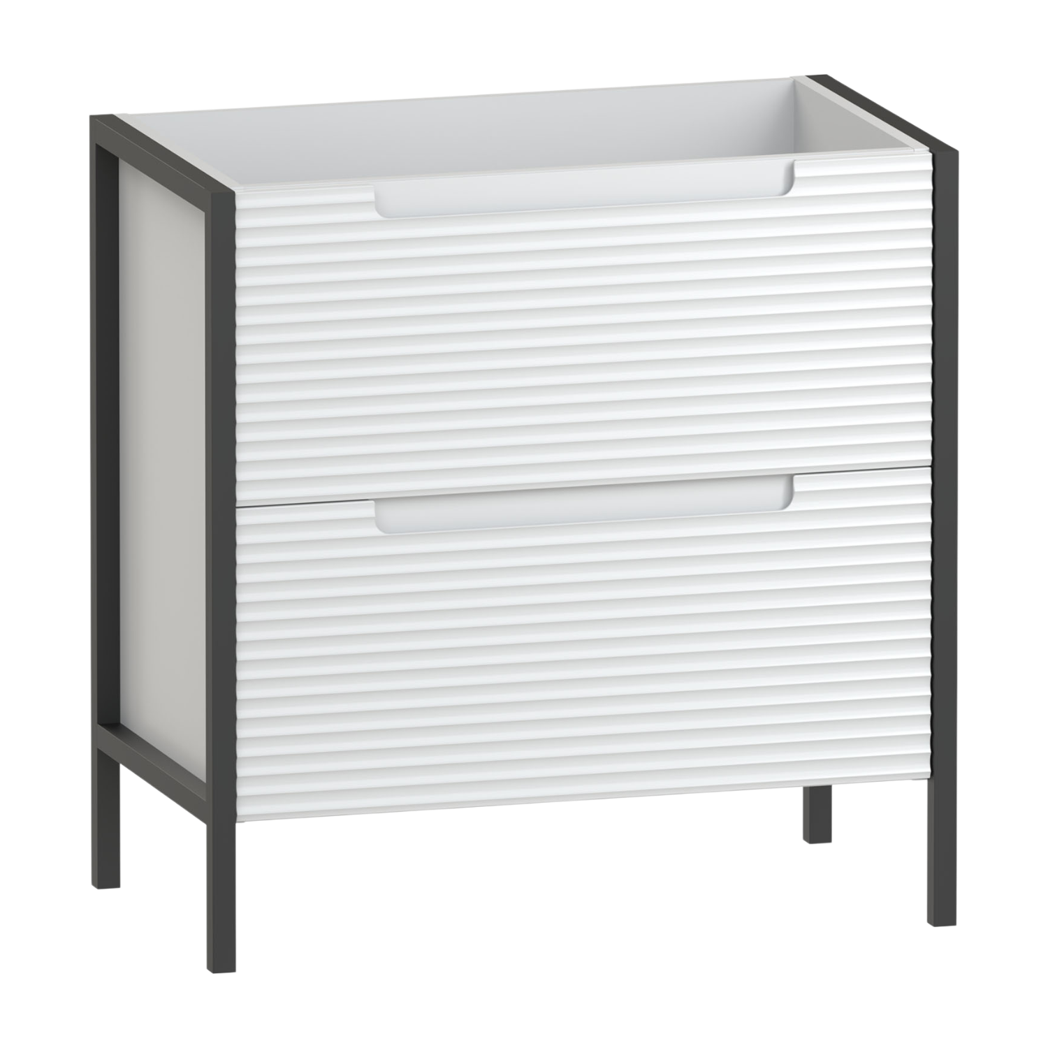 The Valor 800 two drawer anity unit blends a bold black frame with fluted fascias,creating a look that feels effortlessly refined. Two spacious soft close drawers offer ample storage for essentials,while the integrated handle keeps the design sleek and uncluttered. Crafted from high quality furniture board,it balances practical storage with timeless character. Pair with a vanity basin or a worktop and sit-on bowl for a distinct choice of styles.